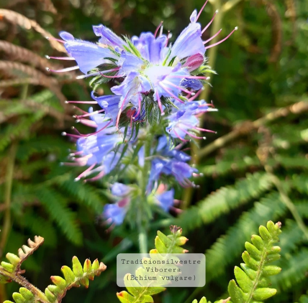 La Viborera, lengua de buey, lengua de vaca, viborera morada – Eugegorri-belarra (Echium vulgare L) es una planta herbácea de tallos erectos, poco ramificados y pilosos que presentan unos característicos puntos negros. Las hojas son carnosas, basales y caulinares, cubierta de pelos adpresos y las flores de color azul violeta tienen forma de capullo tubular con cinco lóbulos y cinco estambres; además de producir gran cantidad de néctar, atraen a las abejas melíferas por la reflexión ultravioleta del color azul. Crece en pastizales, cultivos abandonados, cunetas y en zonas nitrificadas. Su nombre genérico Echium deriva del griego Ekios (víbora), por la forma triangular de las semillas que recuerdan vagamente a la cabeza del reptil. El epíteto latino vulgare significa «vulgar -común. Se creía que protegía contra las picaduras de víbora por el parecido de su fruto con la cabeza de este reptil, pero nada más lejos.