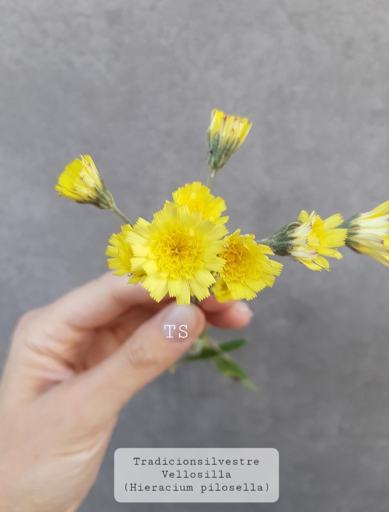 La vellosilla, oreja de ratón, pelosilla- Errabia-belar, Sagu-belarri (Hieracium pilosella) la reconoceremos por sus flores color amarillo pastel. Es una planta de apenas un palmo de altura con hojas basales, en roseta, y lanceoladas, con el revés blanquecino y recubiertas de densa pilosidad.