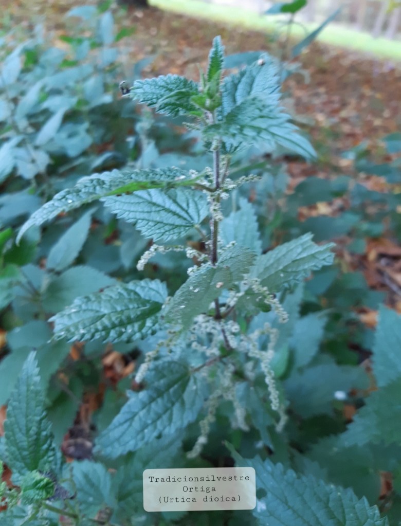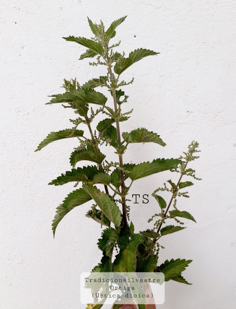 La ortiga – asoin – Urtica dioica es una planta perenne con pelos urticantes que alcanza hasta 1-1,5 metros de altura, muy común en España y en Europa. Sus hojas son alargadas y con los bordes ásperamente serrados y sus flores son de color blanco verdoso, pequeñas y dioicas (de ahí su apellido) y cuelgan formando pequeñas panículas que aparecen entre mayo y julio. Es conocida popularmente como «ortiga mayor» u «ortiga verde» y es la variedad más común aunque hay otras especies. Se propaga fácilmente y crece en suelos húmedos y ricos en nutrientes. La ortiga es una planta antiquísima, lleva utilizándose como remedio desde tiempos inmemorables. Se han encontrado restos que datan de la época neolítica. Los antiguos griegos la llamaron «acalyphe» y los latinos «urtica» que significa «quemar», ya que los pelos de la ortiga pican y queman por el inocuo veneno que desprende la planta al entrar en contacto con la piel.