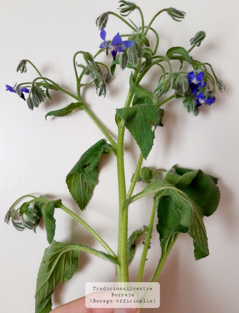 La borraja, borrai (Borago officinalis) es una planta herbácea anual de 30-70 cm, erecta y recubierta toda ella de una pilosidad erizada. Tiene el tallo carnoso, las hojas basales muy grandes, pecioladas, arrugadas y ásperas, y las superiores más pequeñas y abrazadas al tallo. Se caracteriza por los pelos coriáceos blanquecinos que recubren hojas y tallo. Sus flores son bastante vistosas, de color azul y blanco. Es una planta arvense y ruderal, característica del paisaje mediterráneo, que aparece de manera abundante en márgenes de caminos y sembrados desde principios de primavera.
