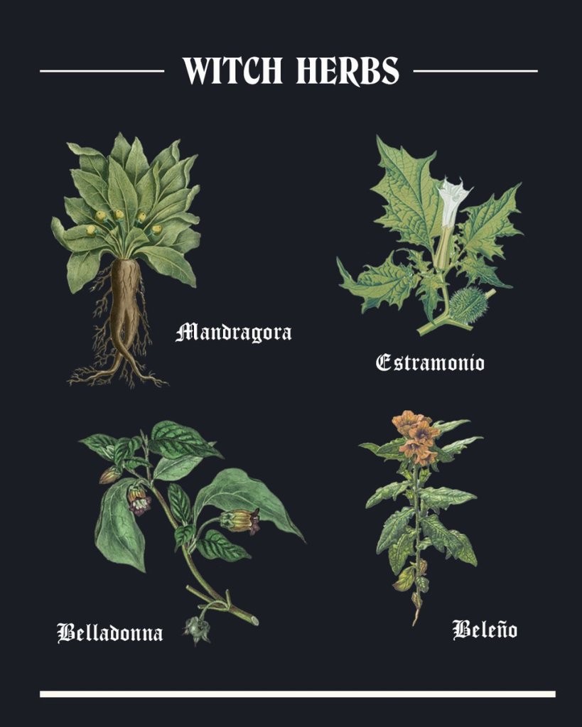 Otras de las plantas usadas en combinación con las anteriores son el eléboro, el opio y el acónito, la cicuta, la dulcamara…