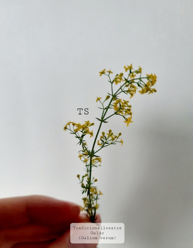 El galio, cuajaleche, presera, sanjuanera – Zia-belar – Galium verum L. es una planta cespitosa, con tallos de 15 – 120 cm, con tallos erectos y cuadrados. Las hojas estrechas y lanceoladas se agrupan en verticilos de 4-12 hojas y las flores son de color amarillo brillante y están agrupadas en densos racimos terminales que florecen de junio a agosto. La planta tiene un ligero olor a miel y sabor amargo, que resulta más intenso en las flores que en otras partes. Se cuenta que sus pequeñas flores amarillas se utilizaban en la antigüedad para enrubiar el cabellos, así como para cuajar la leche para hacer quesos, de ahí que se le conozca como «cuajaleches», su nombre científico deriva del latín galion (gala = leche). En el pasado se rellenaban los colchones con sus flores para que el olor de las mismas mataran las pulgas, quiźas por ello en inglés se l÷ apode «lady’ s bedstraw». Sus hojas se asemejan mucho a las del amor de hortelano (Galium Aparine L., Rubiaceae). Crece en pastos y matorrales, en bordes de caminos y cultivos en cualquier sustrato.