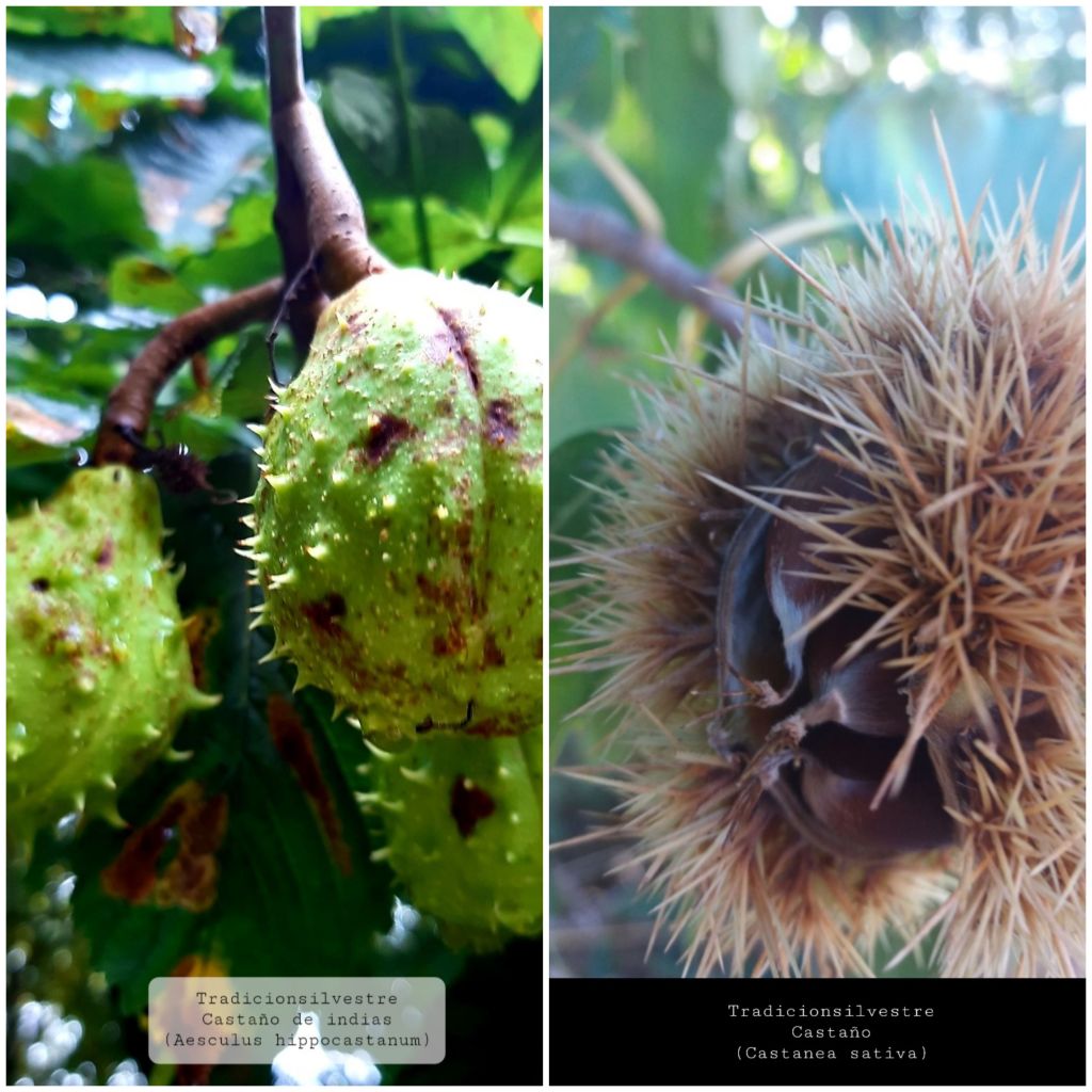 El castaño (Castanea sativa) no debe confundirse con el castaño de Indias (Aesculus hippocastanum), cuyos frutos no son comestibles. La hoja del castaño común es simple, de forma lanceolada, con nervadura pinnada y aspecto coriáceo; mientras que las hojas del castaño de indias son palmeadas y compuestas (con cinco volantes que irradian desde el centro del tallo) y tienen márgenes de dientes finos. Además los erizos del castaño común, al abrirse, tienen aspecto muy velloso, como de puerco espín y dentro de estos erizos, los frutos se agrupan de tres en tres. En el castaño de indias, los erizos no son tan vellosos, sino que presentan cerdas duras salpicadas por su corteza y se agrupan de dos en dos o de forma individual. Las castañas comunes que son las comestibles se diferencian de las de indias en que éstas últimas son más redondas y rojizas, con una base de color blanco y no acaban en punta (algo que sí ocurre con la comestible), su sabor es absolutamente amargo y no es recomendable comerla porque contienen esculina, una saponina toxica para el ser humano.