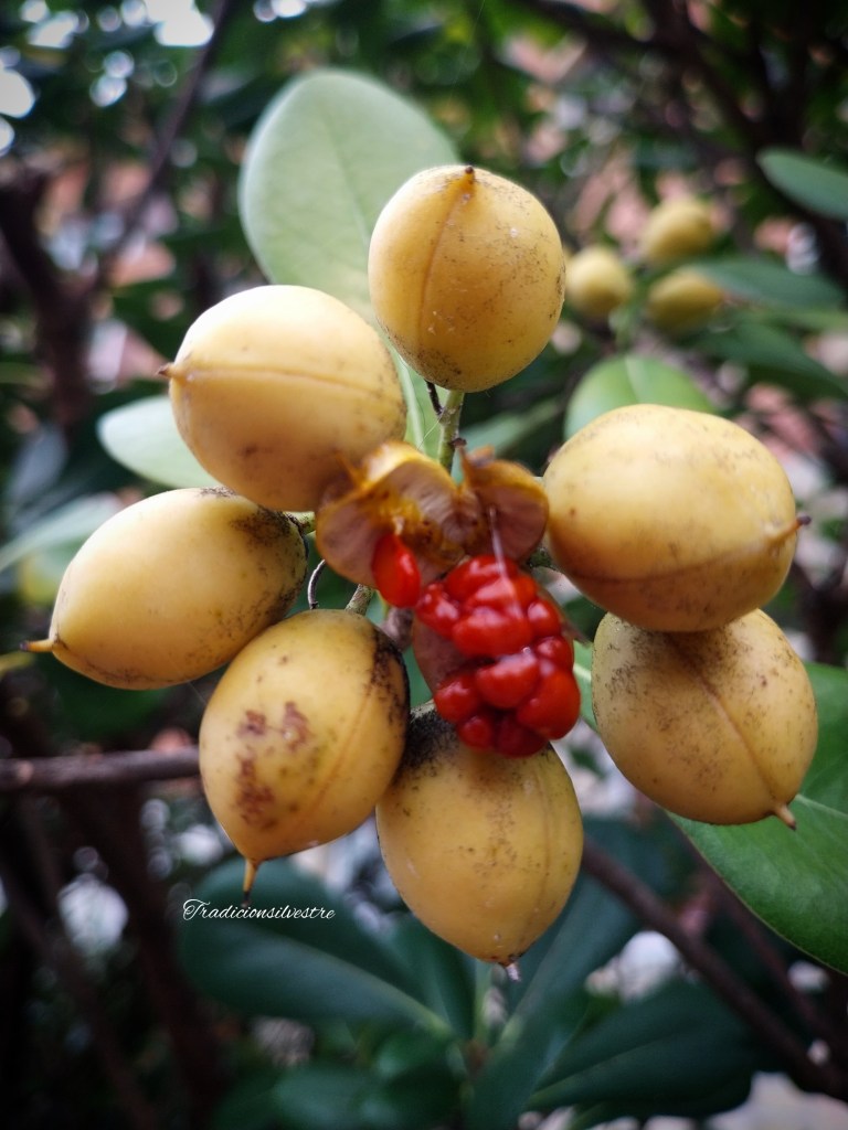 Sus hojas son coriáceas de color verde oscuro y brillantes y ahora en otoño da estos frutos que a mi me recuerdan a “cacahuetes” con